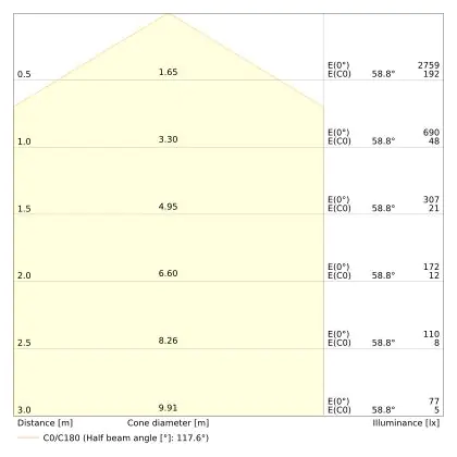 Le code couleur se compose de l'indice de rendu des couleurs (IRC) et de la température de couleur (Kelvin). Le premier chiffre indique le rendu des couleurs (1 = très mauvais rendu des couleurs, 9 = meilleure authenticité des couleurs). Le deuxième et troisième chiffre indiquent la température de la couleur. Exemple : Le code couleur "830" indique que la lampe a un bon rendu des couleurs (8) et une couleur de lumière blanche chaude (30 = 3000K). |