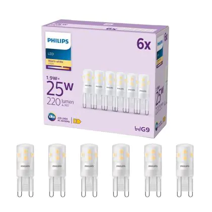 Les ampoules LED G9 sont des petites ampoules en forme de capsule. Ces ampoules vous permettront de remplacer vos ampoules à incandescence et à économies d’énergie sans modification de votre installation actuelle. Cette ampoule Lot 6x Philips LED Capsule G9 Dépolie 1.9W 220lm - 827 est la variante à LED de l’ampoule G9 classique. Cette ampoule Philips se caractérise par sa faible consommation d’énergie. Elle n’utilise que 1.9 W, pour fournir une lumière de haute qualité. Cette ampoule LED est produite par Philips, une marque réputée en matière d'éclairage. Vous êtes donc assuré de sa qualité.